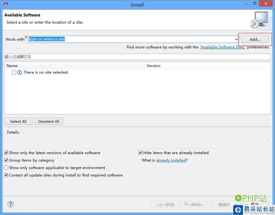 打開Eclipse,依次選擇菜單欄“Help - Install New Software...”,如圖所示,在打開的新窗口中點擊“Add”按鈕,然后在“location”文本框中輸入剛剛復制的內容,點擊“OK”按鈕即可。