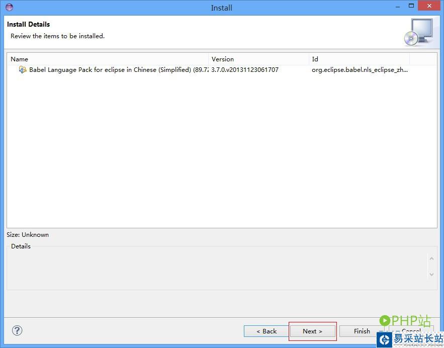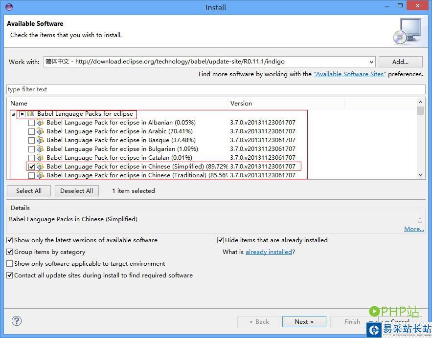 此時看到“Pending...”即正在等待中,用戶等待片刻便會看到軟件檢索到的語言包列表,下拉垂直滾動條,選擇“for eclipse”下的Chinese Simplified(簡體中文)包,點擊“next”按鈕進入下一步。