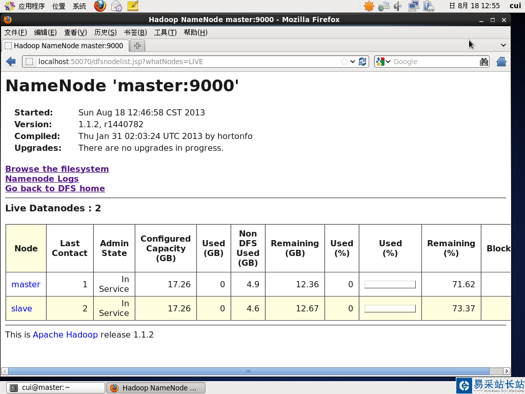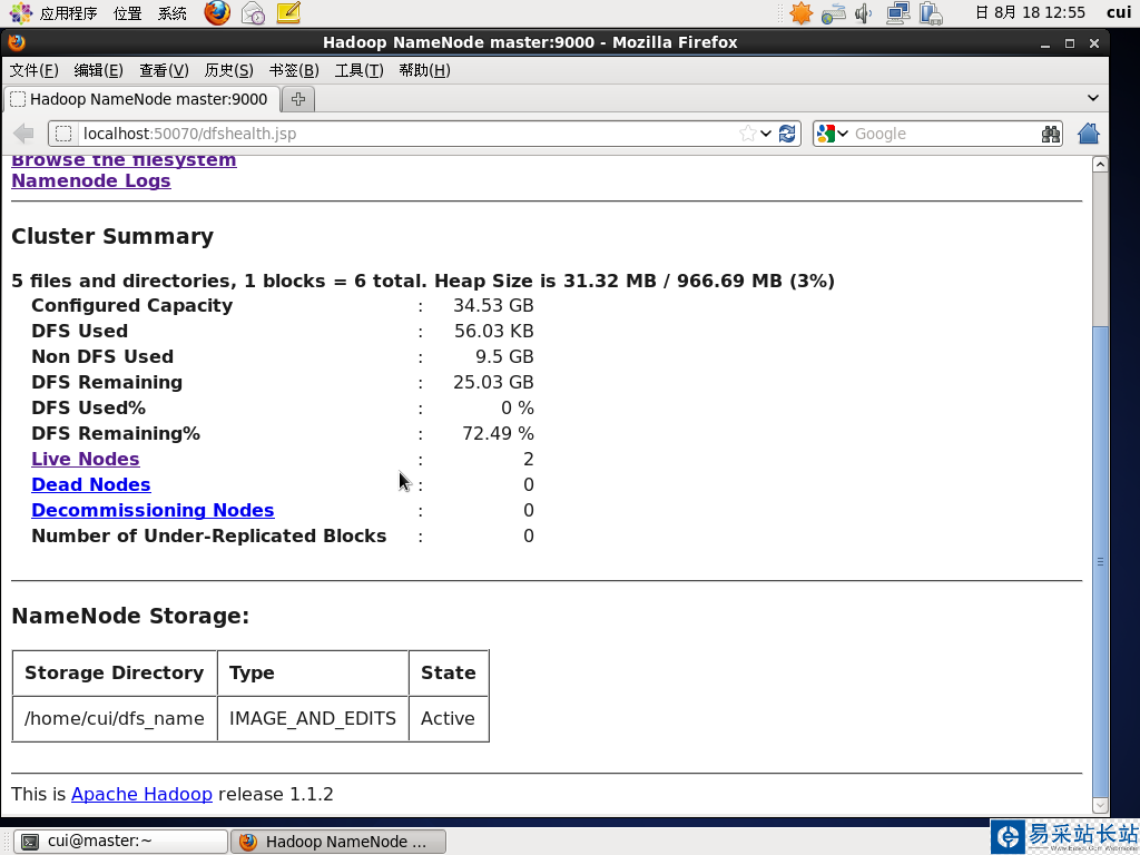 以上看到LiveNodes的個(gè)數(shù)為2,說明啟動(dòng)成功。
