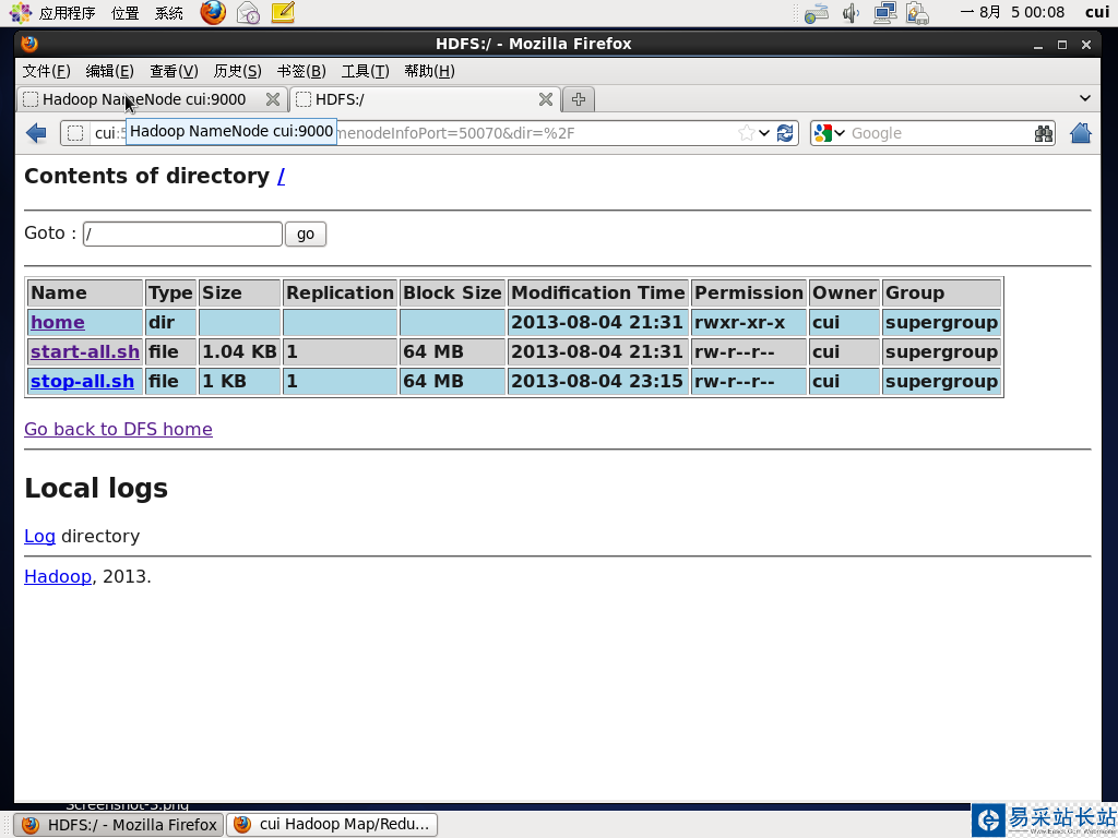 hdfs://cui:9000/ 表示存放在HDFS中的根目錄中。