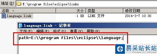下載完解壓縮后,會有個包含features和plugin目錄的eclipse文件夾,把這個eclipse放在我們的Eclipse安裝根目錄,也就是和eclipse.exe同一級目錄下。然后仍然在這一級目錄下,新建一個links文件夾,并在該文件夾內,建一個language.link的文本文件。該文本文件的名字是可以任取的,后綴名是.link,而不是.txt喲。好了,最后一步,編輯該文件,在里面寫入剛才放入的語言包的地址,并用“//”表示路徑,一定要有path= 這個前綴。