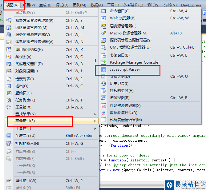 同樣下載安裝重啟VS,來(lái)查看效果。重啟VS之后首先在菜單中視圖===其他窗口===JavaScript Parse。