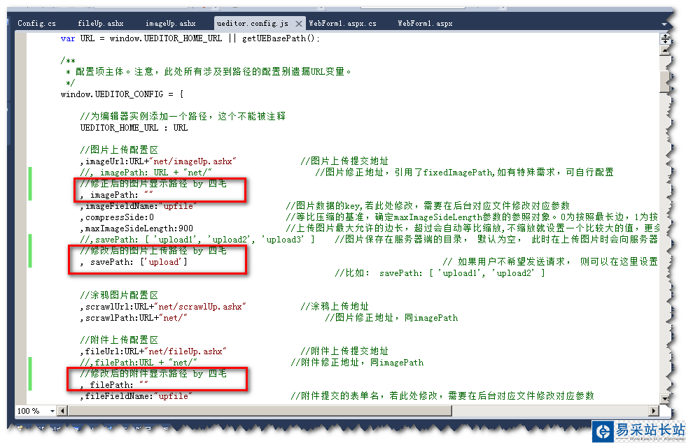 步驟3.修改Config.cs文件,見下圖。因為步驟1中我們修改了ueditor.config.js中圖片上傳配置區圖片保存路徑,所以這里也需要修改否則會報:非法上傳目錄