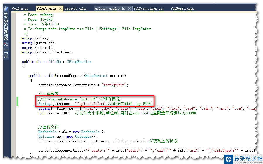 步驟4.修改fileUp.ashx文件,見下圖,紅色框即為修改后效果。