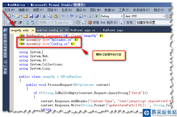 6.不要氣餒,我們繼續,打開net文件下的imageUp.ashx,將下圖紅框中的內容給刪除,我們上傳不成功全是這兩行代碼在搗鬼。