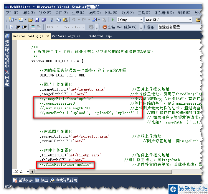 4.打開ueditor.config.js,然后將下圖中紅框中的代碼取消注釋。注意第二個紅框是和附件上傳有關,為了方便,這里一并取消注釋。