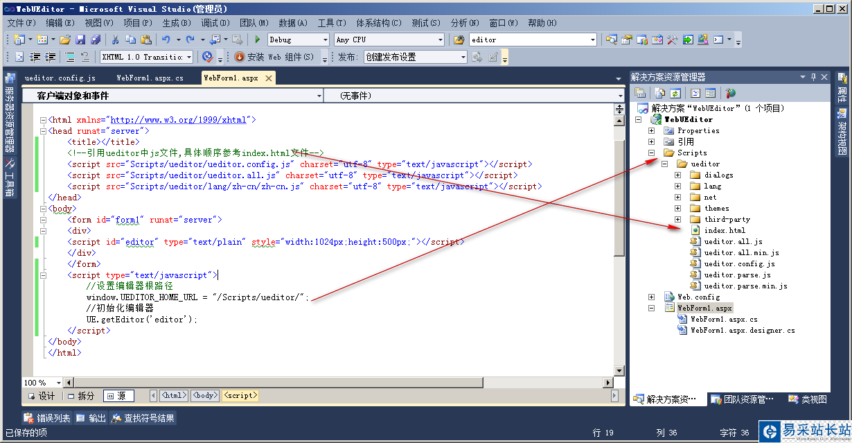 2.打開vs2010創建一個空的web應用程序,并將我們下載的UEditor,解壓放到需要的地方,然后引用相關資源到頁面上,我的如下: