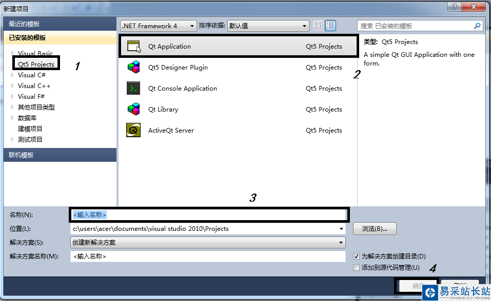 選擇:文件->新建->項目->Qt5 Projects->Qt Application,輸入工程名,下一步...進行新建。