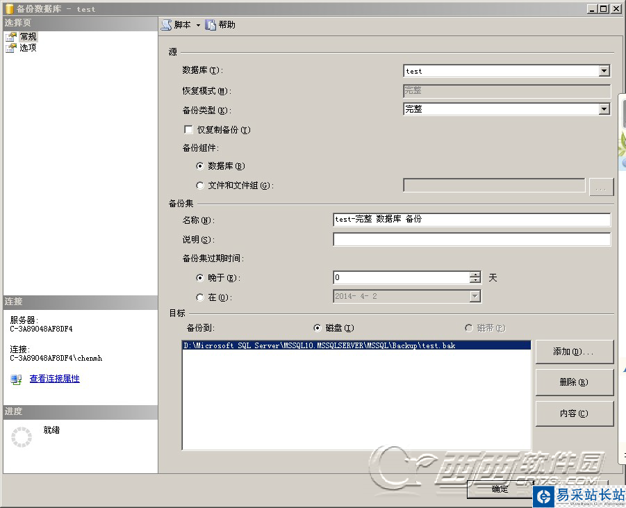 use master goBACKUP DATABASE [test] TO DISK = N'D:/Microsoft sql server/MSSQL10.MSSQLSERVER/MSSQL/Backup/test.bak' WITH NOFORMAT, NOINIT, NAME = N'test-完整 數(shù)據(jù)庫 備份', SKIP, NOREWIND, NOUNLOAD, STATS = 10GO