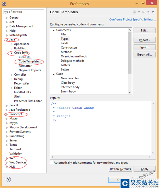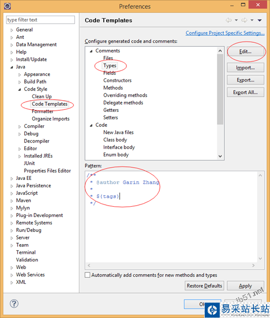 進入Eclipse->Preferences->Java->Code Style->Code Templates->Code->New Java Files, 修改為如下: