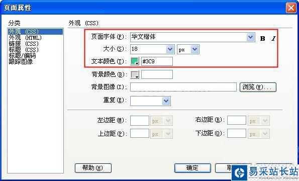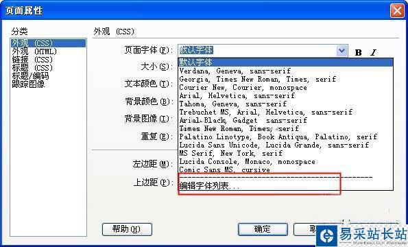 在“頁面屬性”窗口中,我們可以對字體進行顏色、大小、字體等修改,如果你在字體下拉菜單中找不到你想要的字體樣式,可以點擊“編輯字體列表”,如下圖所示。
