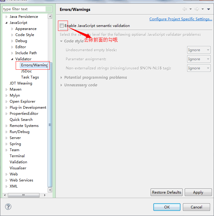 1 window->preference->Java Script->Validator->Errors/Warnings->Enable Javascript Sematic validation