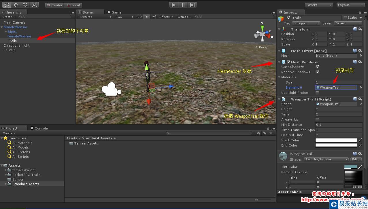 然后給角色的模型添加一個空對象,并且加上 MeshRender,并且設置好材質為 WeaponTrail,另外給這個空對象添加 WeaponTrail.cs 對象,設置好相關屬性,如圖: