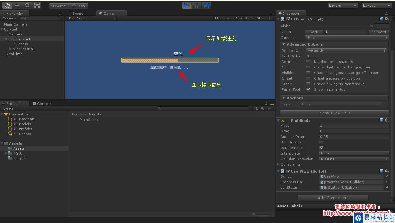 Unity3D 加載場景有很多種方式,做一些小的 DEMO 的時候往往是直接使用 Application.LoadLevel 或者 Application.LoadLevelAsync 函數加載場景,具體可查看(http://www.xuanyusong.com/archives/1427),但是這種辦法不適合在真正的 Unity3D 開發中,因為前一種需要把所有的場景都打包,這在某些情況下是不現實的,比如開發頁游,我們不可能把所有的場景都打包讓用戶下載,我們需要一個場景一個場景的加載,這時候我們可以使用 WWW 先通過 HTTP 加載場景到本地緩存,然后再使用 Application.LoadLevel 或者 Application.LoadLevelAsync 函數加載場景,使用這種加載方式,不僅不需要 Build Settings -> Add Current 處理加載場景,進度條的顯示也更加容易,但是使用這種方式,需要先把場景打包成 unity3d(查看詳情) 或者 assetbundle(查看詳情) 文件。