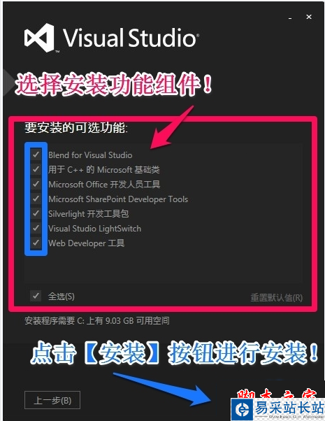 5.選擇安裝功能與組件,單擊【安裝】按鈕,開始安裝!