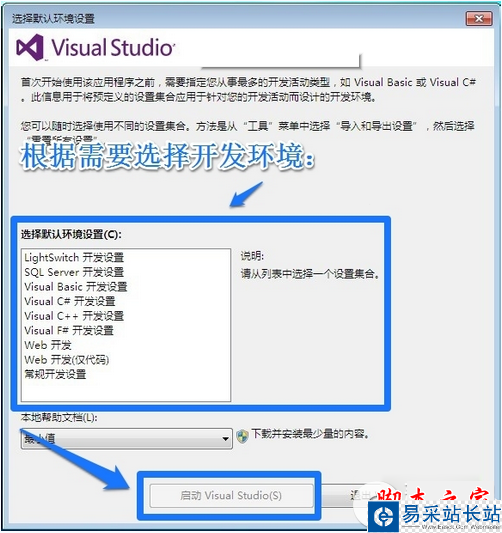 10.進入默認環境設置,根據自己的需要設置默認環境,如果您使用多鐘語言進行開發,則可選擇【常規開發設置】,設置完畢后單擊【啟動 Visual Studio】啟動程序!