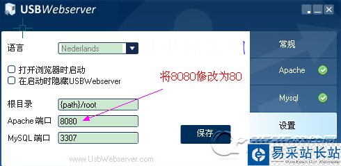 3、由于該工具包默認開啟的網站端口為 8080 ,所以我們需要進入“設置”,將Apache端口手動修改為 80 ,點擊保存后如果沒有生效,請關閉軟件重新打開即可解決~