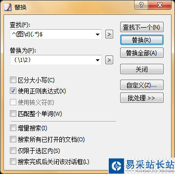 在以上方法中,最關鍵的技術難點是兩個小表達式的構成??此坪唵螀s包含了豐富的內容。其中“查找”表達式“^(圖/d)(.*)$”中使用了代表段首的前導字符^和段末字符$;而兩組括號則定義了兩個字符串段位,并給每個段位暗含定義了1和2兩個代碼,“(圖/d)”是代表“圖n”的階段字符串,其中/d代表了不確定的一個數字,“(.*)”是代表該行此后剩余部分字符串的通配表達。而“替換為”表達式“(/1/2)”則是在添加一組“()”的同時,在括號中原樣引用上面曾經定義過的兩組字符串。