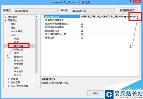 2、然后彈出文件的屬性頁,單擊1“預處理器”,再單擊2打開預處理器如下圖