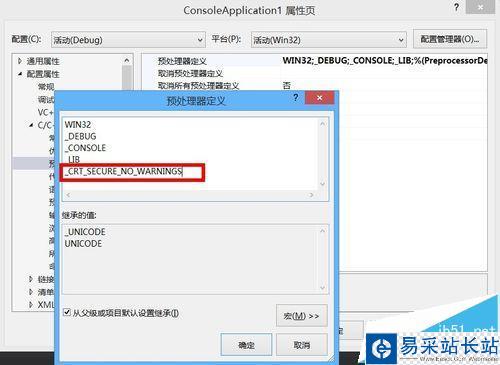 3、將“_CRT_SECURE_NO_WARNINGS”復制在以下紅色框內,然后確定再單擊應用即可。