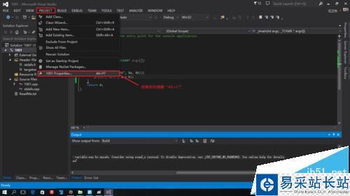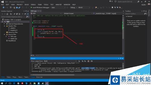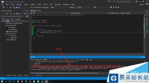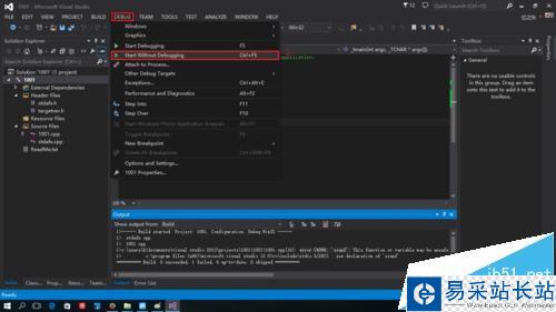 3、工程創(chuàng)建完成后,在“1001.cpp”文件中我們寫一段最簡單的“a+b”程序,如下圖中紅框內(nèi)的代碼。寫完之后并進(jìn)行編譯,可以直接按“ctrl+f5”,或者點擊導(dǎo)航欄“Debug”之后再點擊“start without debugging”,如圖2