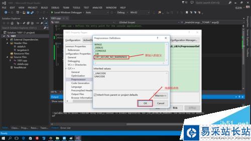 8、之后會出現(xiàn)如下窗口,在紅框中可以進(jìn)行編輯,我們在其中加入“_CRT_SECURE_NO_WARNINGS”并點擊確定。如圖2.
