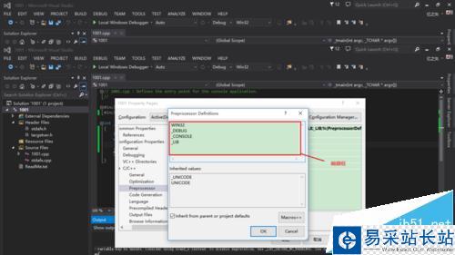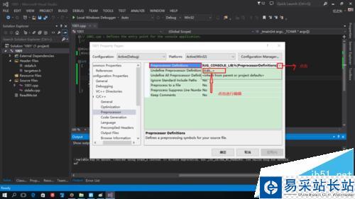 7、完成上述步驟后,選擇“Preprocessor Definitons”,這時會發(fā)現(xiàn),右側(cè)有一個倒三角,點擊它會出現(xiàn)兩個選擇,我們選擇“Edit”。如圖