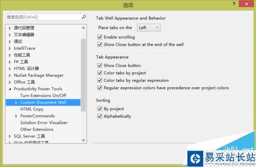 6、Visual Studio 2013重啟完成后,我們就可以對安裝的工具進行設置了。從頂部菜單選擇“工具”——“選項”,在彈出的選項窗口中,左側即顯示了“Productivity Power Tools 2013”的設置項。