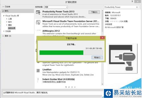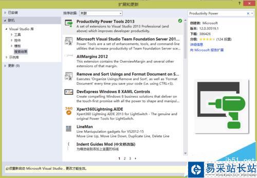 5、安裝成功后,在“擴展和更新”窗口下方會提示“必須重新啟動 Microsoft VVisuaol Studio,更改才能生效”,點擊提示右側的立即重新啟動。Visual Studio 2013會重啟。