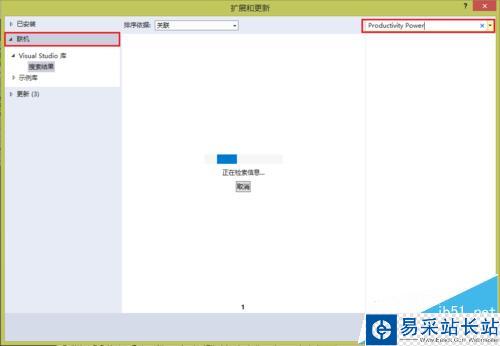 2、在彈出的窗口左側選擇“聯機”,然后右上角的搜索輸入框中輸入“Productivity Power”,搜索正在進行中,等待搜索結果。