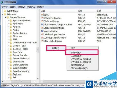 4、然后來到Explorer的右側窗口,在空白處,右鍵點擊,在彈出的菜單中選擇“新建”->“字符串值”這一項。