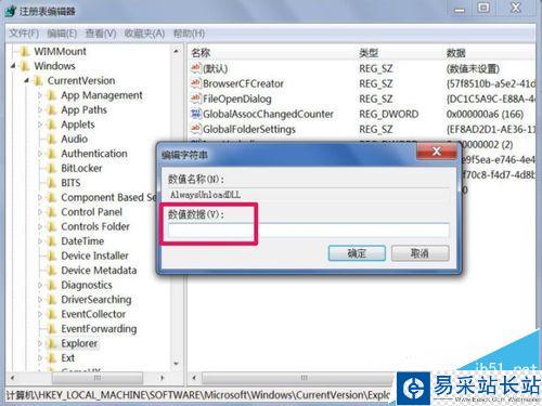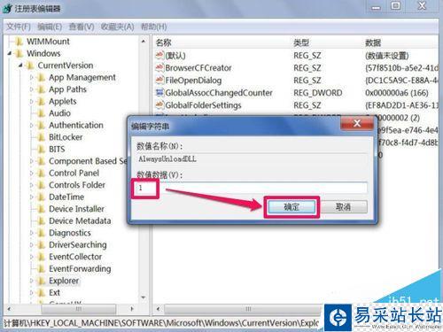 8、如果要限制加載多余的DLL運行庫文件,把這個空值改為“1” ,然后按“確定”保存,注冊表就修改完成了,重啟一次電腦,就能生效。