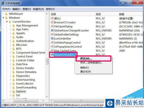 6、改完后,在AlwaysUnloadDLL上面右鍵,選擇右鍵菜單中的“修改”這一項。