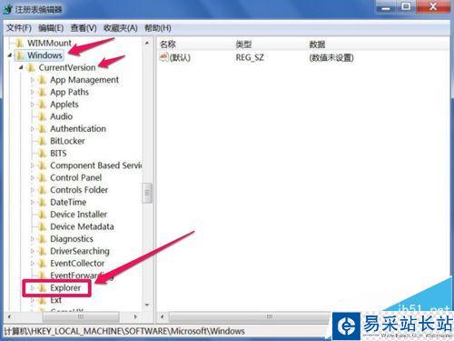 3、然后依次打開[HKEY_LOCAL_MACHINE/SOFTWARE/Microsoft/Windows/CurrentVersion/Explorer],最后定位于Explorer上。