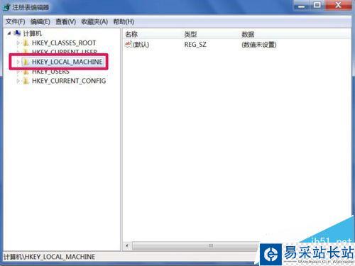 2、進入注冊表之后,在五個根鍵中,選擇“HKEY_LOCAL_MACHINE”這一根鍵。