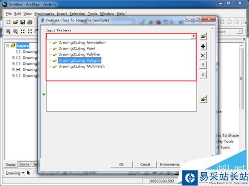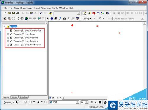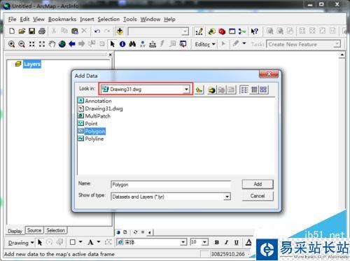 1、首先,打開ArcMap,加載CAD文件,可以全部添加進去,也可以單個添加各個要素;這里全部添加進去是一個組合,也可以將其拆開(Ungroup)。