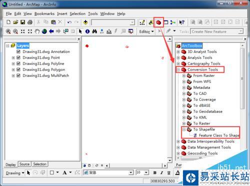 1、這種方法采用ArcToolbox里的命令功能,加入數據的方法同上,單擊工具箱圖標,彈出ArcToolbox,以此選擇Conversion Tools》To Shapefile》Feature Class To……。