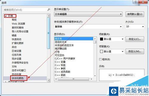 4、在選項列表中,選擇“環境”->“字體和顏色”。