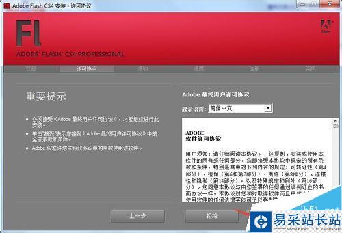 2、進入歡迎界面,選擇“我想安裝并使用 Adobe Flash CS4的試用版”,然后點擊“下一步”,如下圖所示:
