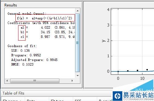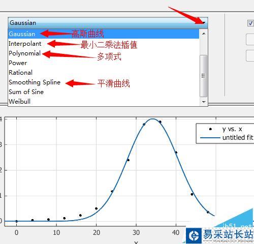 4、選擇擬合的曲線類型,一般是線性擬合,高斯曲線,平滑曲線等,根據需要選擇。選擇完后會自動完成擬合,并且給出擬合函數表達式。