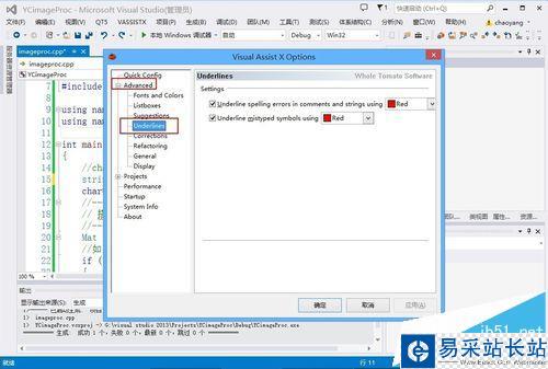 3、執行第2步操作后會打開VS助手的選項設置頁面,在這個頁面里我們可以對VS助手做出相應調整,更改它的語法檢查項等等,在下圖中找到“Advanced”——”Underlines“,如下圖所示