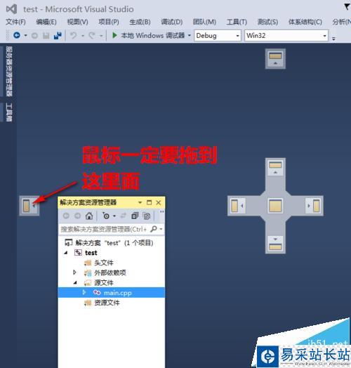 3、這時,要特別留意拖動時自動出現的歸位提示框。鼠標一定要拖到提示框內才放手。這時,系統會自動將解決方案資源管理器放到合適的位置。