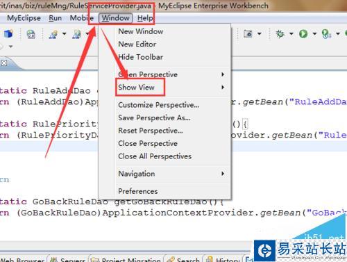 2、點擊eclipse頂部導(dǎo)航中的windows選項,選擇ShowView視圖。顯示視圖界面。