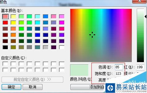 10、把色調(diào)調(diào)成:85 飽和度調(diào)成:123 亮度調(diào)成205 即可調(diào)成豆沙綠色了 然后點(diǎn)確定確定