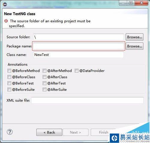 4、然后就會(huì)彈出了一個(gè)new testng class的選項(xiàng),進(jìn)行再package name中進(jìn)行輸入class文件名。