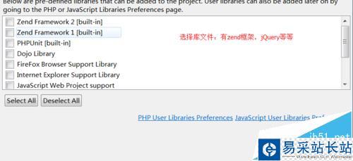 3、擇庫文件,這里有javascript,jQuery等等,也可以什么都不選,選擇好之后點擊finish,這是,php項目就創建好了,如圖所示;