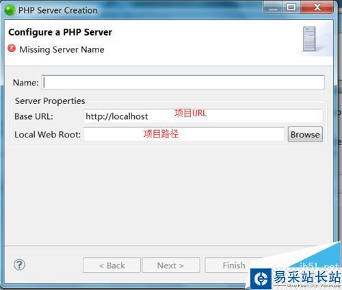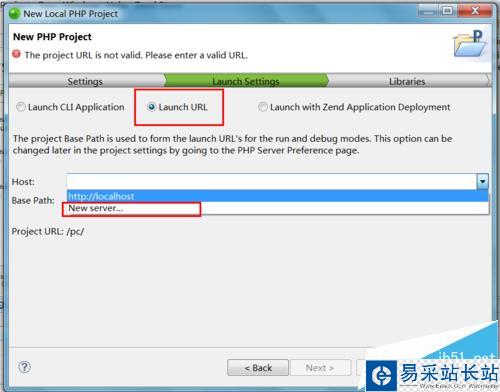 2、擇Launch URL,選擇host,可以使用默認的localhost,也可以自定義:下拉框--new server--填寫host name--url--選擇本機項目路徑--finish;