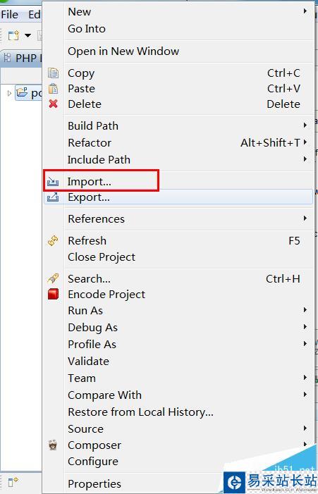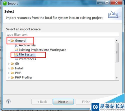 4、是你會發現,這個項目只是個框架柱,沒有具體的工程文件,這時就需要我們使用zend studio導入功能導入項目文件了。選中你的項目名稱--右鍵--Import--在彈出的窗口中General--File System--next;