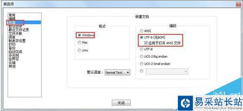 3、選擇新建-選擇windows-選擇UTF-8(無BOM),勾上應用于打開ANSI文件就可以了,如圖