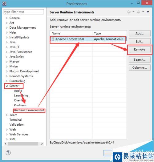 2、展開Server—>Runtime Environment,選中列表里對應的tomcat—>Remove(如這里的Apache Tomcat v6.0),點OK保存修改